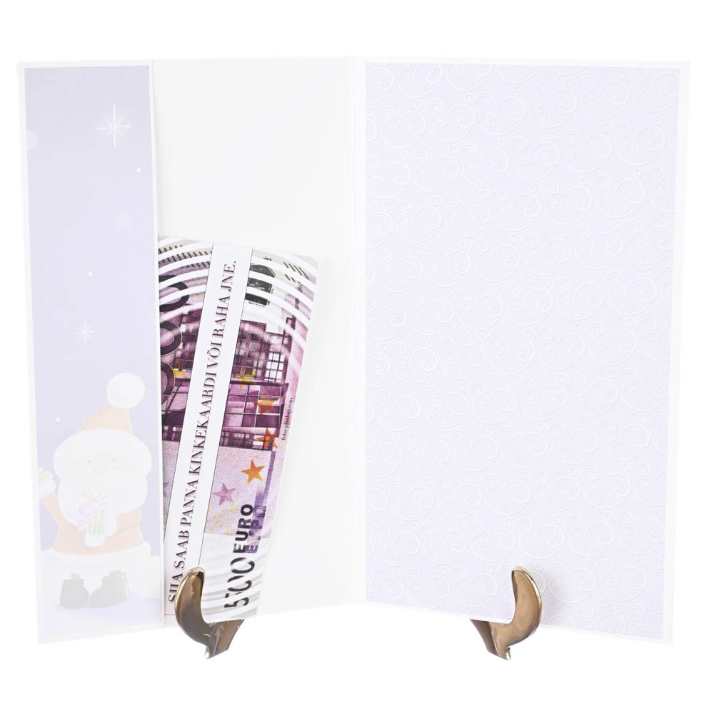 Selle jõulukaardi muudab unikaalseks ruumiline atsetaatkiht, mis on kinnitatud kaardi keskele nii, et jääb õhku hõljuma. Sellele kihile on trükitud valged lumeräitsakad, misloovad mulje, et lumi sajab päriselt pildi ees. Koos kuldsete ääristuste, valgete pärlite ja rõõmsate jõuluvanadega on tulemuseks mänguline 3D efektiga kaart, mis eristub tavapärastest jõulukaaridest.