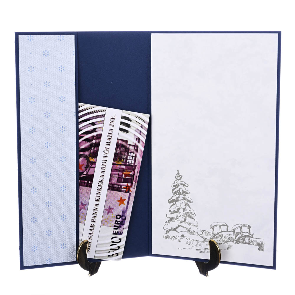 See käsitööna loodud jõulukaart ühendab endas hubasuse ja talvise pidulikkuse. Kaardi keskmes seisab puidust põder, kellel on pehme karvane kasukas ja kaelas nöörist lipsuke. Taustal avaneb kaunis lumine maastik, mis loob ehtsa jõulumeeleolu.